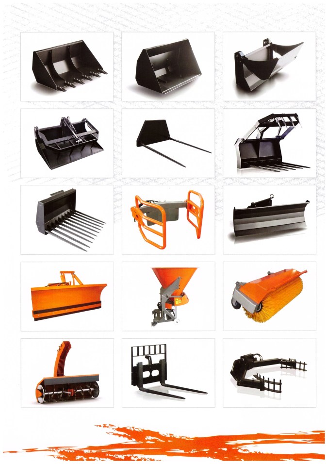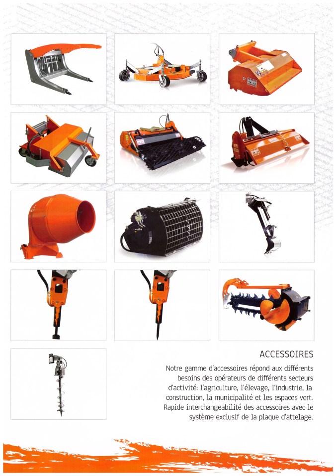 De nombreux accessoires sont disponibles en option (différents godets, fourches, pinces, balayeuses, tondeuses, taille-haies, mais aussi marteau hydraulique, tarière, etc…)